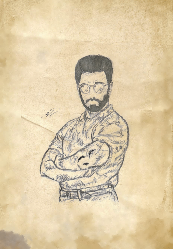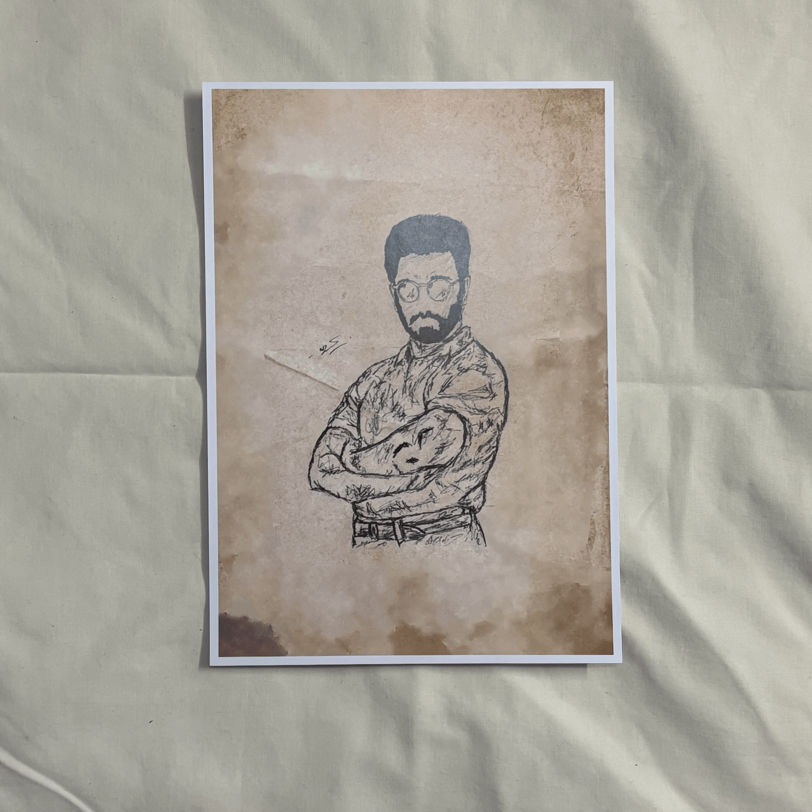 A vintage A4 colour print of an original sketch of Kamal Haasan from his film Nammavar (1994) by Janani Jegan.